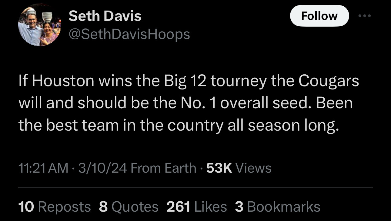 How about even if we don’t win the big12 tourney we deserve a 1 seed?