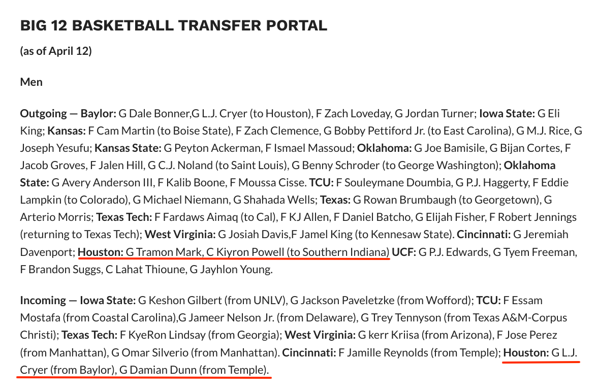 “With Temple’s Damian Dunn also coming to Houston, the Cougars just added 30 points to the backcourt.”
