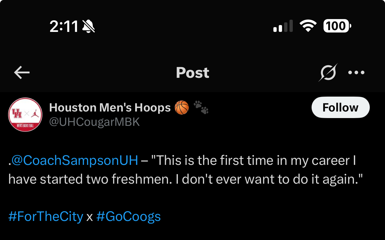 not sure if I like this quote from Sampson. It will be used against him in recruiting and it may change how we recruit moving forward. May look at more portal guys. Elite Freshmrn want to start.