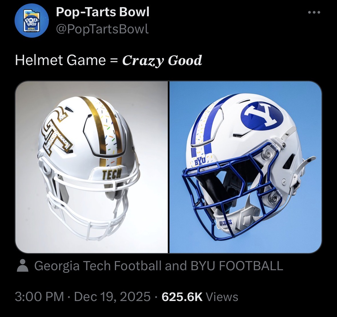 GT and BYU unveiled custom helmet stripes (and for GT, a custom logo) for the Pop-Tarts Bowl, the only postseason game that still matters.