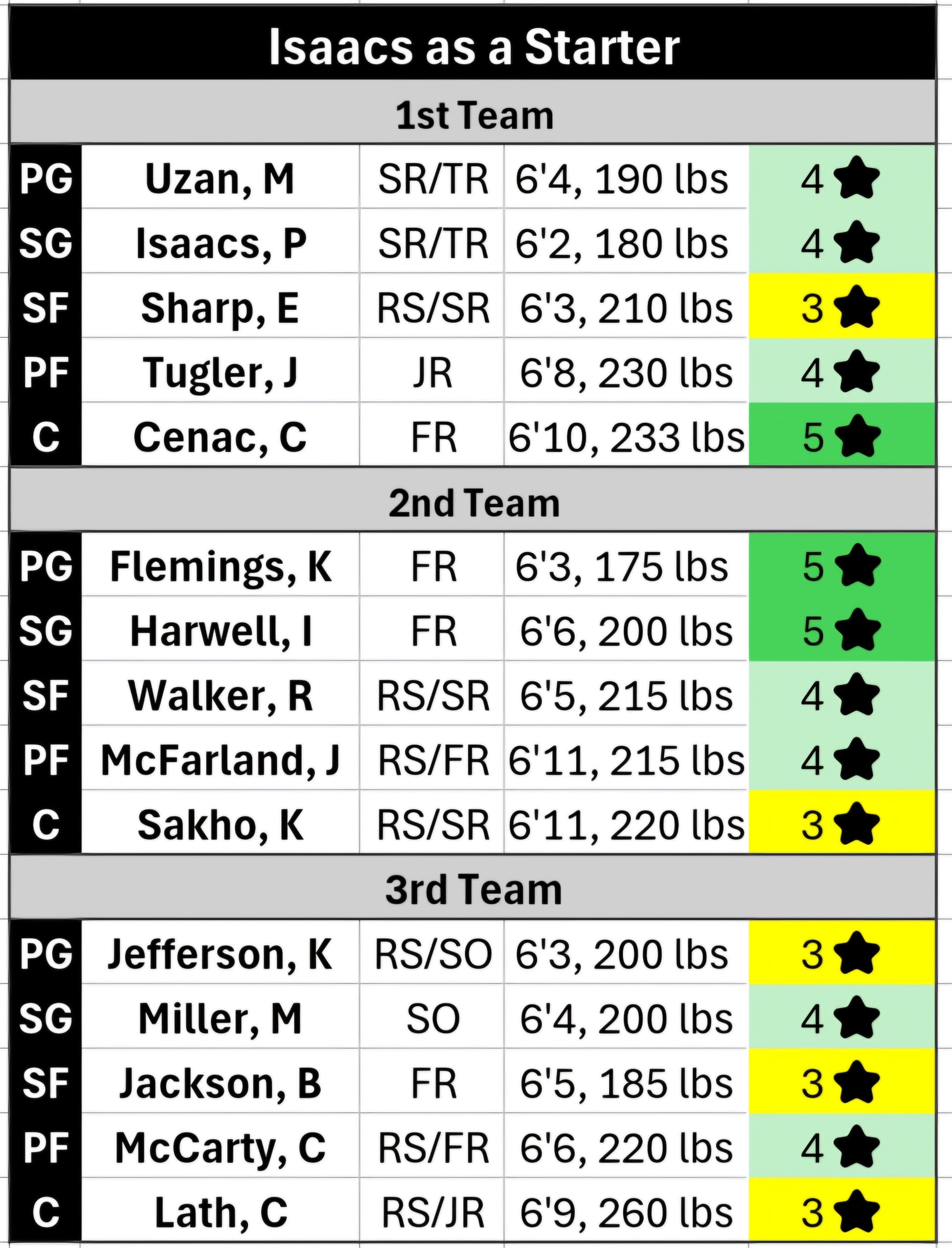 This isn’t complicated. Tugler, Uzan and Sharp all start again if they all return. Cenac comes in day 1 and is expected to start just like Jarace did. The last starter is Isaacs or Harwell take your pick but I expect Isaacs to start if healthy and him, Sharp and Harwell to mix and match with each other throughout the game at the 2 and 3 spots somewhat interchangeably. Flemings comes in when Milos goes out and McFarland, Sakho, and Lath will compete to be the go to big off the bench.