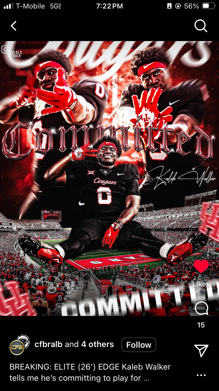 One of the kids UH is targeting is Carson Crawford, OLB, Carthage, TX. He reminds me of Michael Batton. Appears to be a little taller than Batton. Multi-sport athlete. Very productive in high school. Would be a solid add.