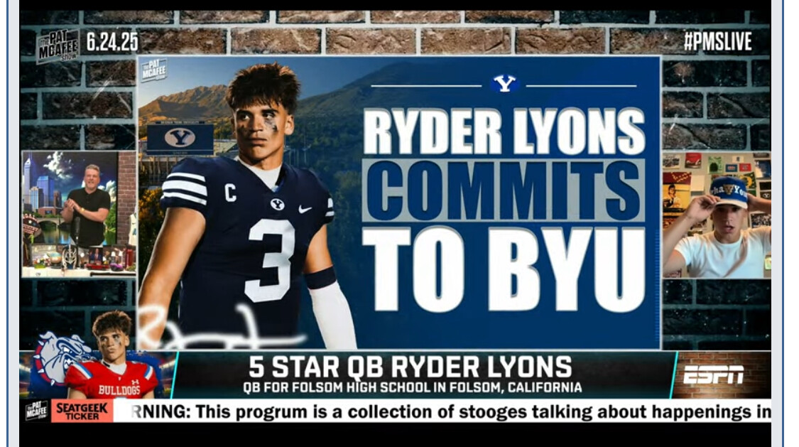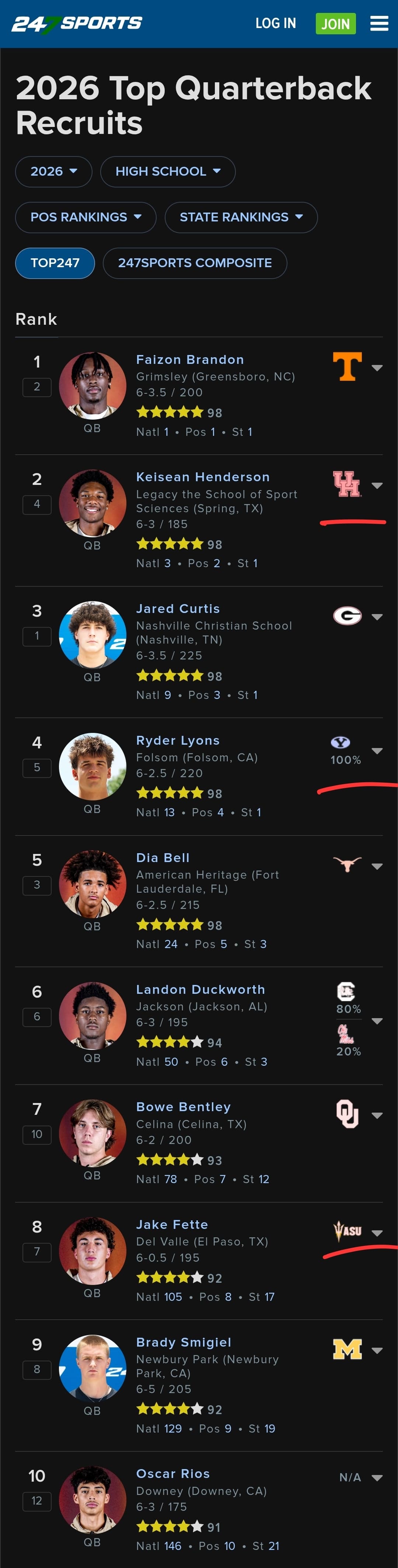 Big12 doing work for 2026! Per 247 and On3, BYU is predicted to land Ryder Lyons. That would give the conference 3 of the Top 10 QBs of the 2026 class. That could become 4 as it looks like #10 Oscar Rios is deciding between Arizona and UCLA.