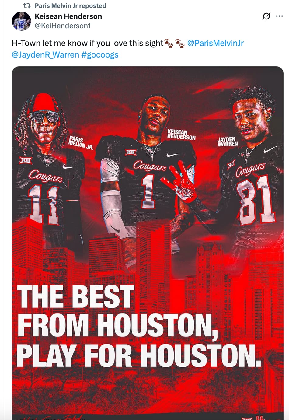 Paris Melvin Jr. reposted the tweet below from Keisean Henderson with Melvin and Jayden Warren in UH unis.