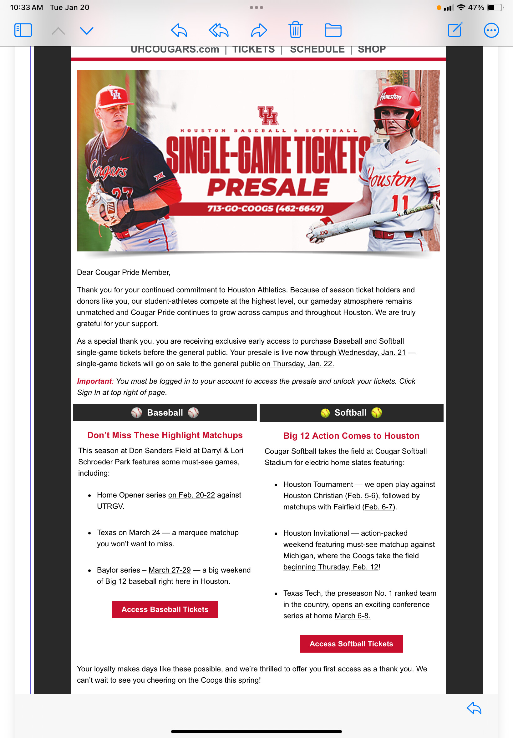 The email above refers to group tickets. Single game tickets for Cougar Pride members just went on sale.
