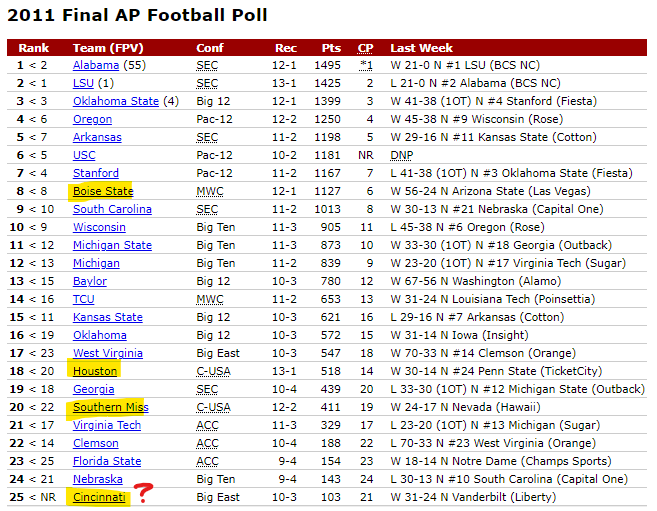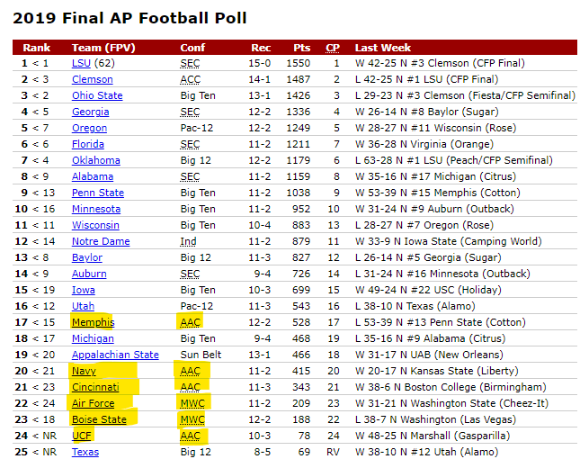 Thanks! I was surprised that there were that many instances where several G5 ended up the season ranked in the Top 25. I just remember 2011 being the peak of C-USA.