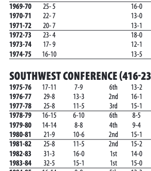 | 1973–74 | Guy Lewis | 17–9 | |||