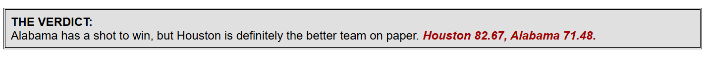 According to Ken Pom Ratings: Net Rank Hou 1, Ala 10. Def Rank Hou 3, Ala 48, Off. Rank Hou 4 Ala 3.