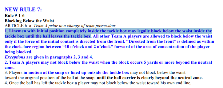 Only interior linemen can block below the waist from the side. Everyone else’s blocks below the waist must come from the front. Previously, other offensive players were allowed to low-block from the side as long as they were inside the tackle box — the area about five yards in either direction from the snapper, and extending backward to the offense’s goal line.