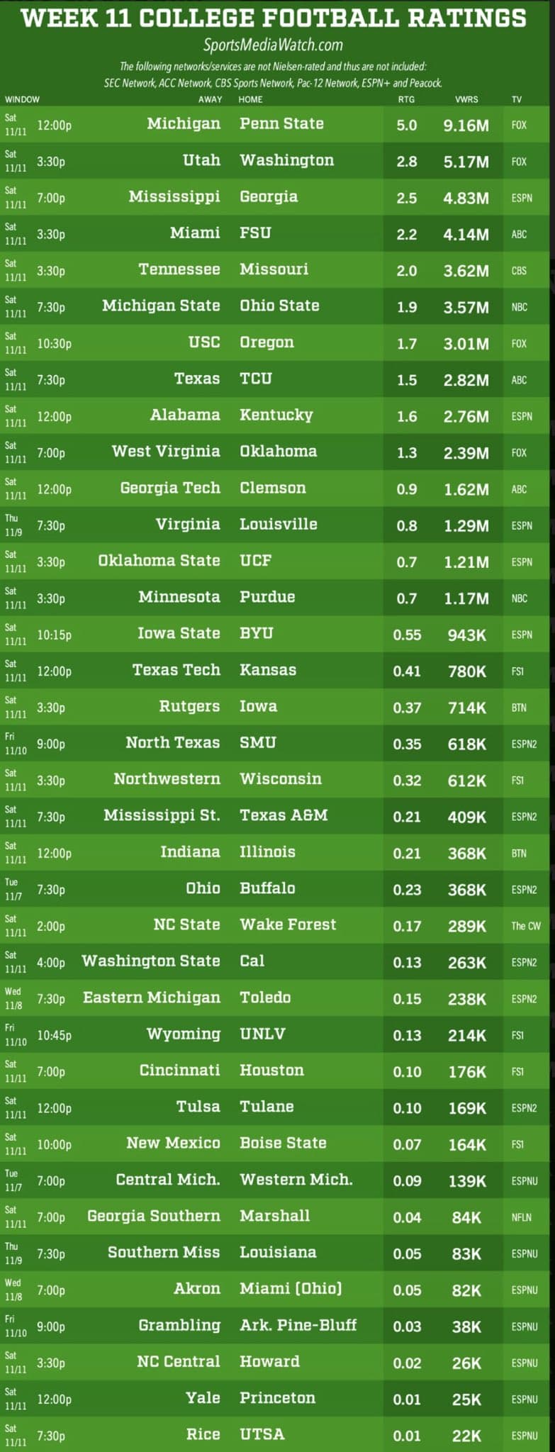 yeah ATM barely had double us - that is pretty surprising. In fairness to us, in the same window of the UH game were games featuring, OU, UT, Ohio State, Georgia, and ATM - most of which were on network. There was just no way we’d do a decent number unless UH was 8-1 and Cincy 9-0 or something.