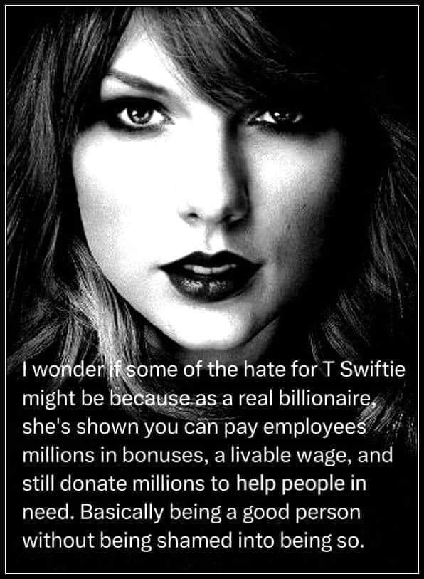 You keep posting it like you have to. Did you even consider that some people do not like her music or her persona? It seems like you can accept that and YOU and some others like to define it as hate. You, yes you JohnnyCougar HATES it that some people can have their own feelings toward her. What are we machines and have to admire her? What is this? I admire Mother Theresa. She is a Saint. I admire MLK is a saint to me. Honestly I could care less about Taylor Swift. I am glad she is a Billionaire, good for her.