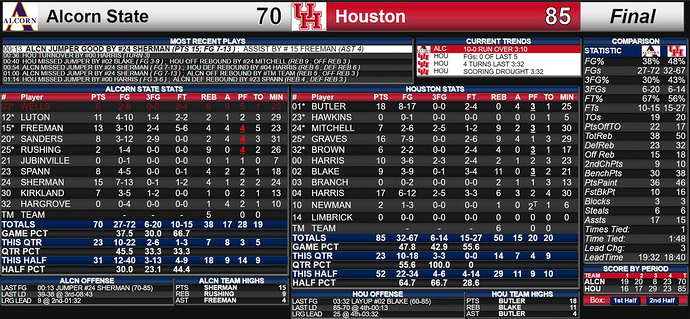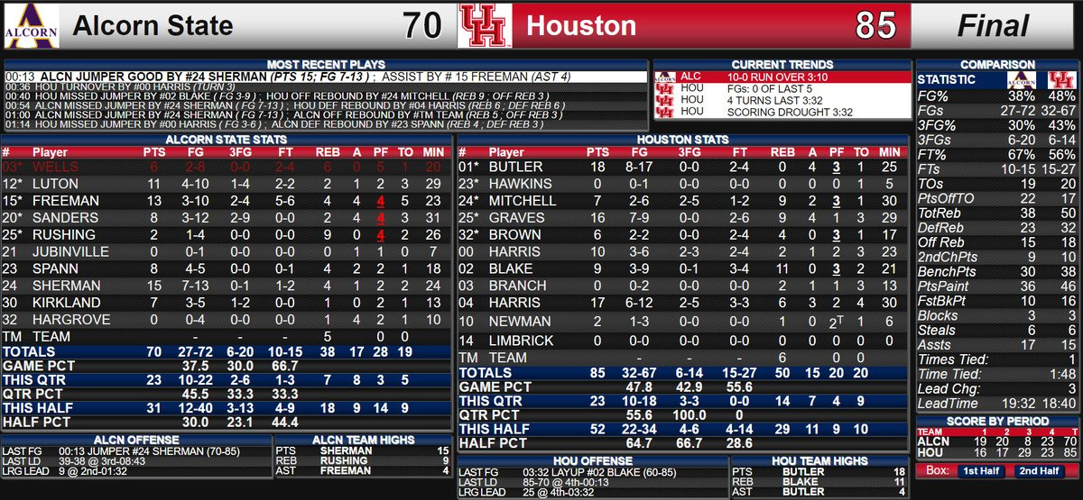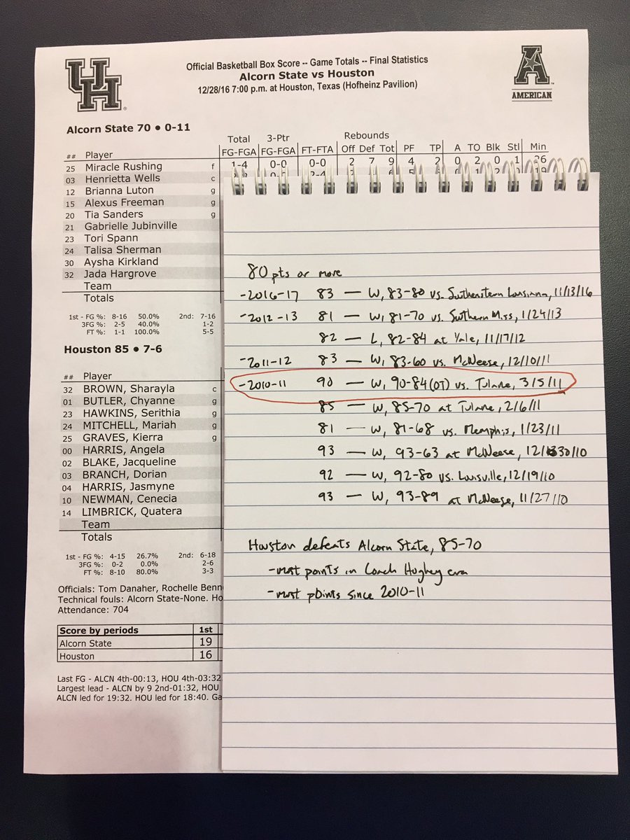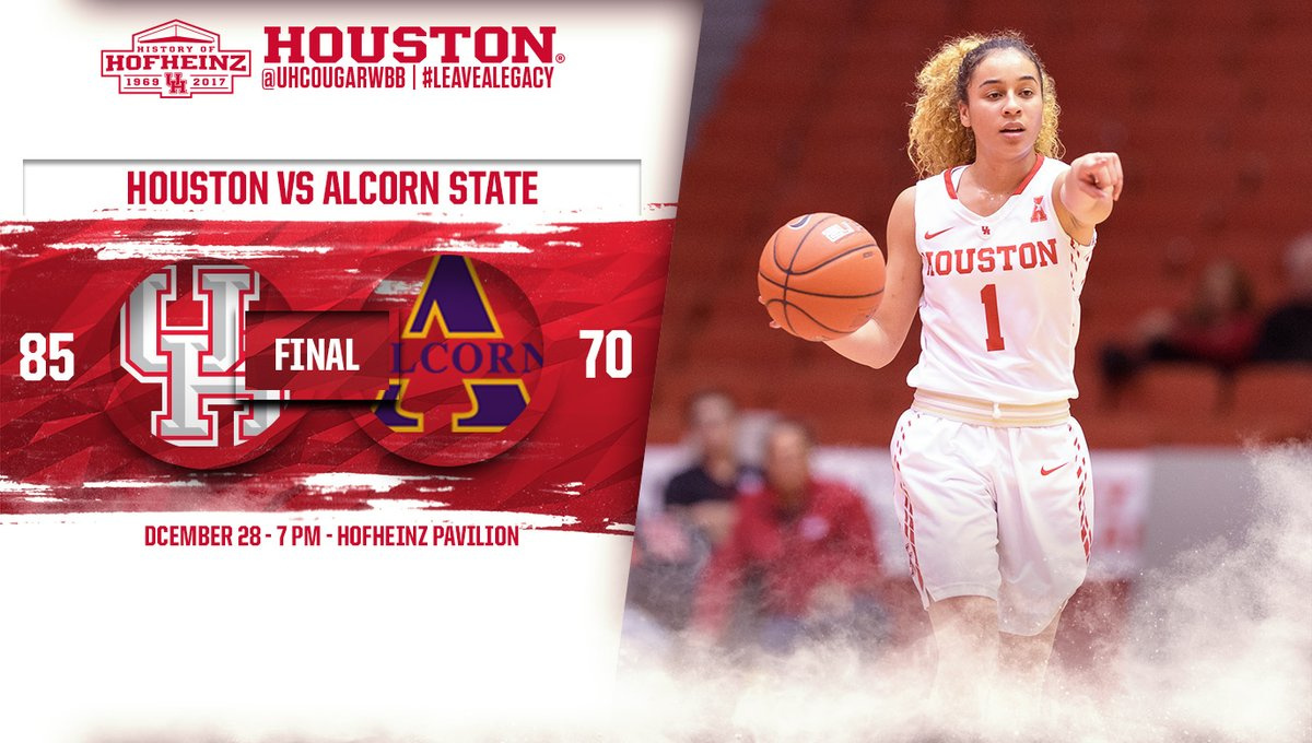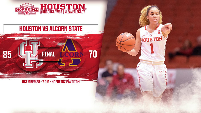 The 85 points scored for Houston is the most under Hughey, and the most the team has scored since a 90-84 win over Tulane on March 5, 2011. Houston finished the non-conference portion of its schedule with seven wins, a new high for Hughey. The 29 points Houston scored in the third quarter is the most in a single quarter for the Cougars this season. Houston had previously scored 27 in a quarter twice this season. Houston won the bench-points battle for the 11th time this season, outscoring Alcorn with their reserves 38-30. Houston’s 50 rebounds, and 32 defensive boards, are the most the team has collected in a game this season. Since her first double-digit scoring game on Dec. 4, Jasmyne Harris is averaging 14.7 points per game over that seven-game span. The Cougars shot 47.8 percent (32-of-67) from the field in the contest, a new season-high.