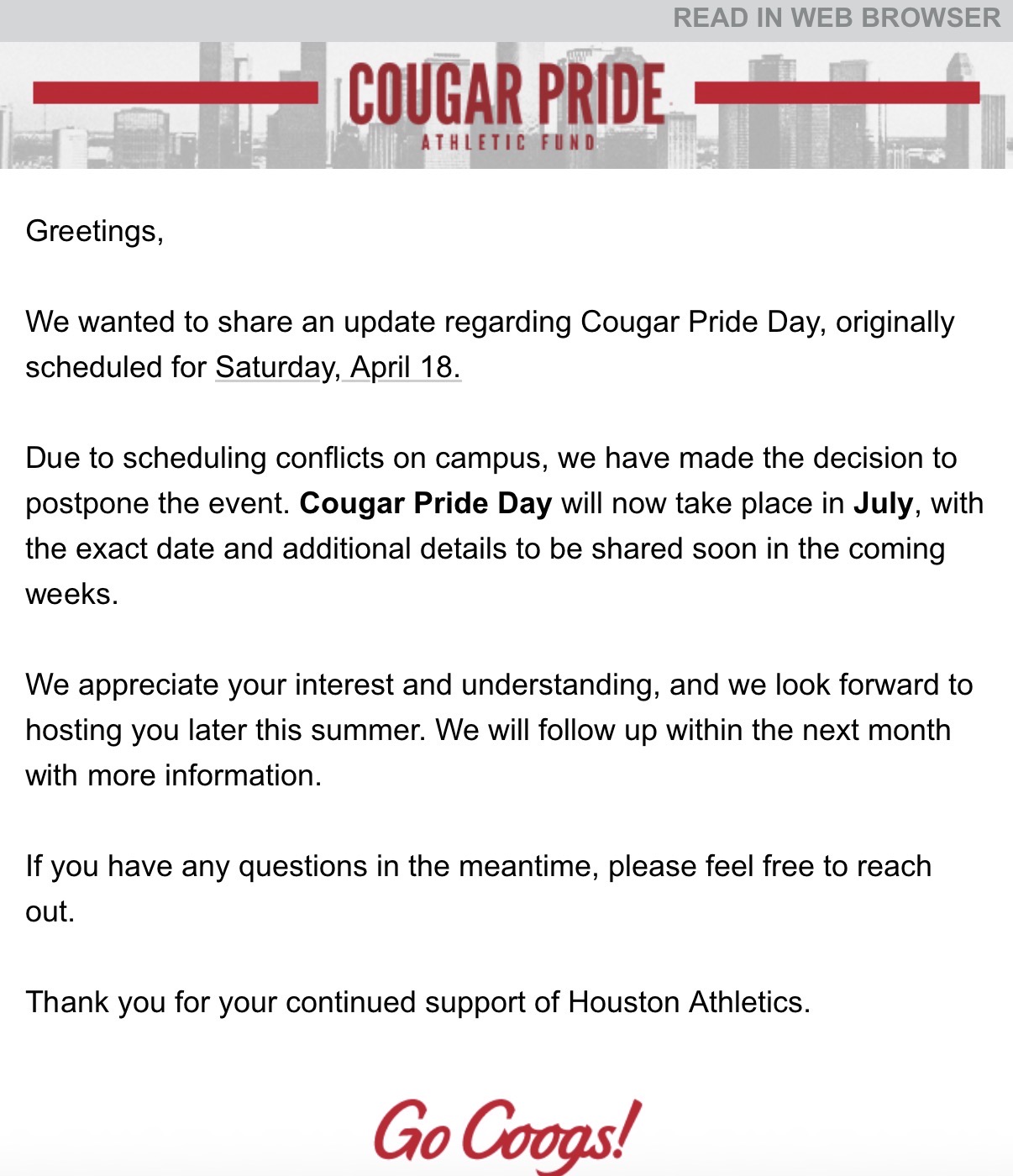 Yawn. So letâs gloss over the broken commitment for perfect attendance day and promote Cougar Pride Day.
