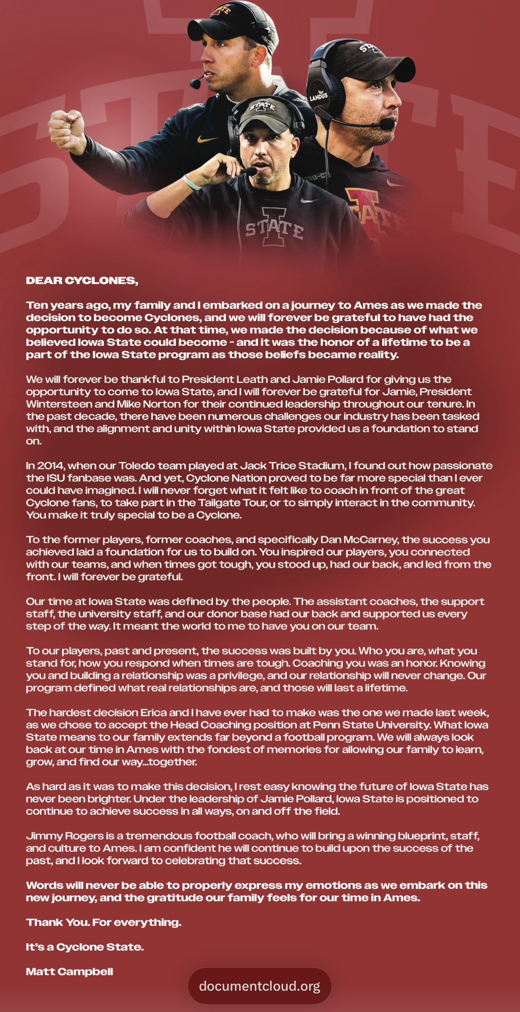 Matt Campbell buys an entire page in the Des Moines Register to say thank you and goodbye to Iowa State.