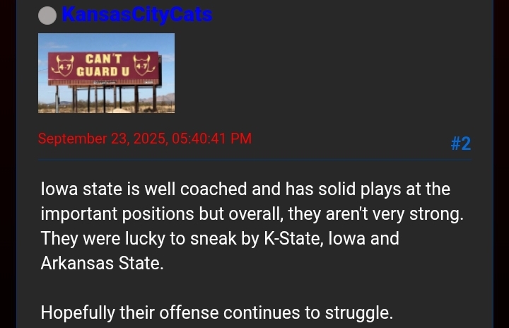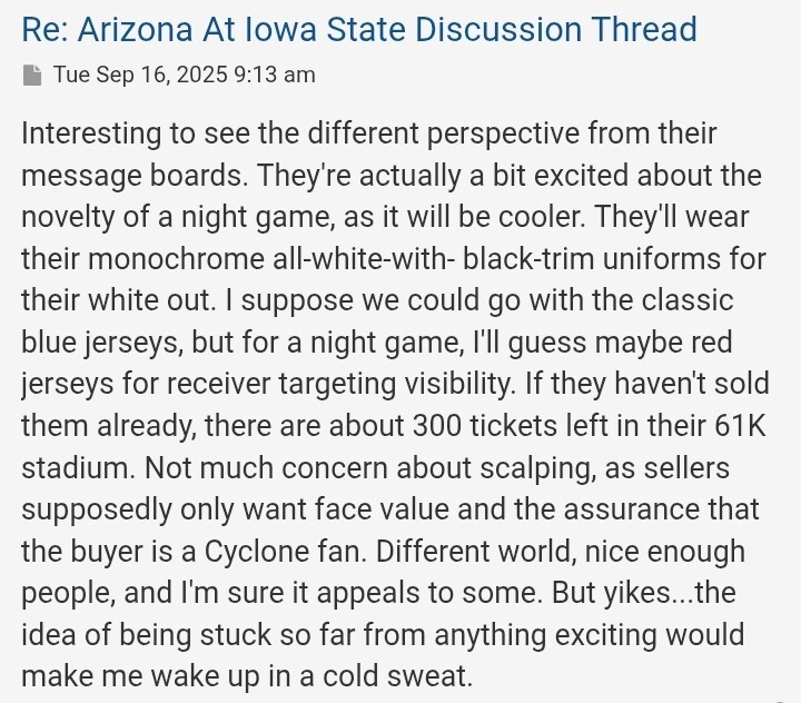 I’m one of those who had no idea why Iowa state would have a large following, then in the BIG12 we see how mobilized you are. We, Houston, just wish we had that following. We can get there, but it is going multiple years of high quality football. I’ve been to Ames, went by Jack Trice Stadiuum - wasn’t impressed. Honestly, it’s just a small town compared to Houston. However, it beats Lubbock by 1000. Then I see the picture above. We don’t compare yet for stadium fillup nor the ambience. As a Houston guy, we have seen a few big time events at our stadium. But are way back in fan base. Best of luck this week.