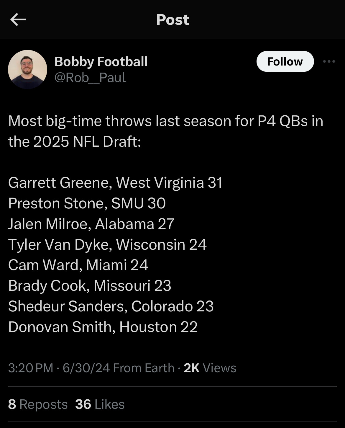 Smith release is looking smooth! He got invited to the Manning passing camp. Tune did going into his senior year as well. I wasn’t sure if I bought into smith coming into the off season. But after hearing some draft buzz and seeing him on mock drafts. I came around to being really excited for what smith can do for us this year. I think Fritz’s will get the best out of him. I think smith taking the spring to sit back and learn from bell and Fritz’s and see the game in a different light might end up being a blessing in disguise