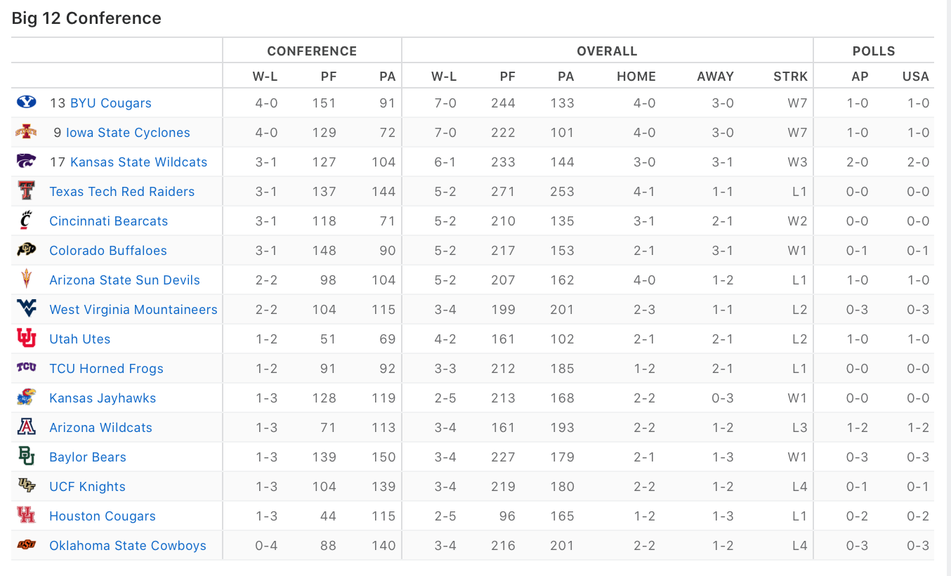 Updated League standings as Texas Tech drops to 4th in the conference standings, Cinci now holds their own fate in their hands if they win out, playing Texas Tech, ISU, and Kansas State