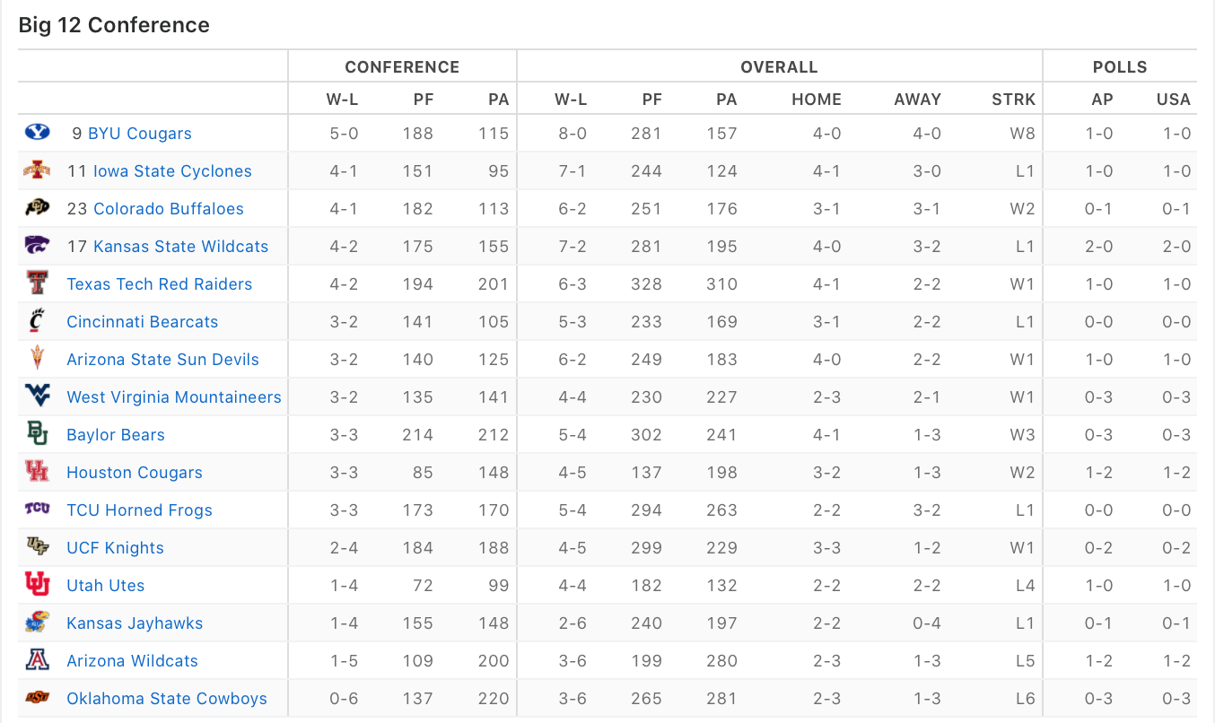 Last place team in the Big 12 beat the 7th place SEC team based on todayâs standings.