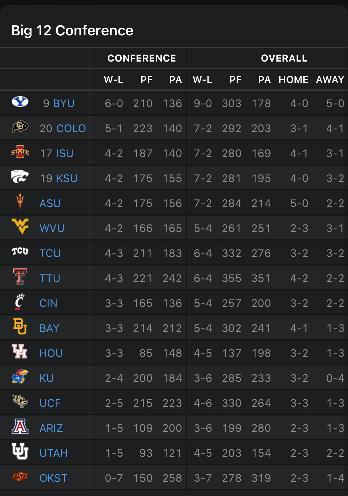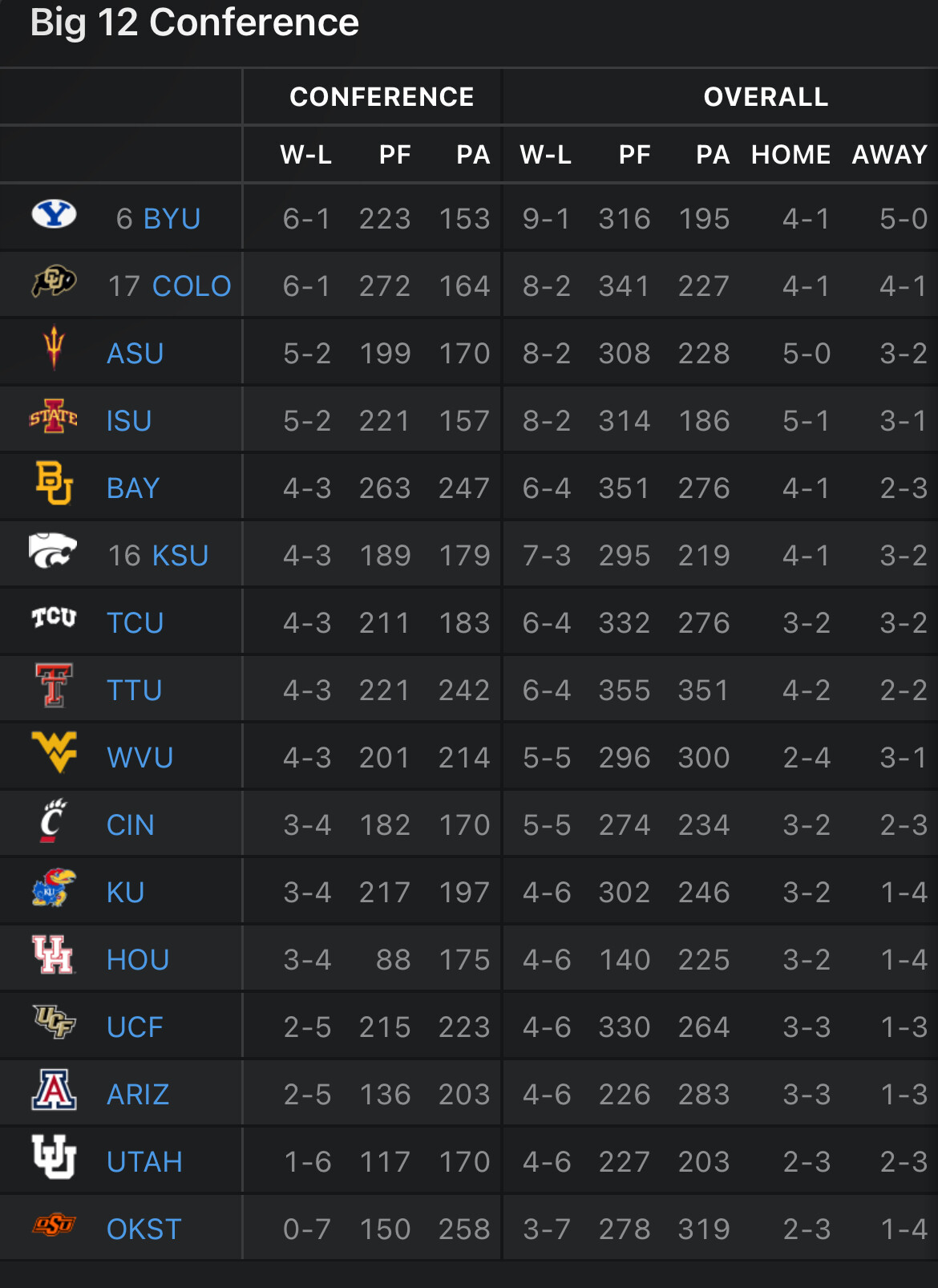 Apparently BYU still currently has the tiebreaker on ISU with the common opponent, talk about cats have 9 lives. Not sure if K-State is a chip shot for ISU either. Gonna be a ton of Houston Cougar fans next week.