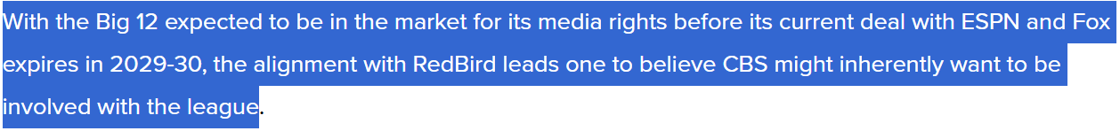 “To date, the RedBird ecosystem has delivered over $145 million of contracted revenue to the Big 12 and its member institutions,” the Big 12 said in a statement to Yahoo. “This partnership would provide the Conference with a world-class strategic and capital partner, while preserving 100% of the member institutions’ equity in the Big 12.”