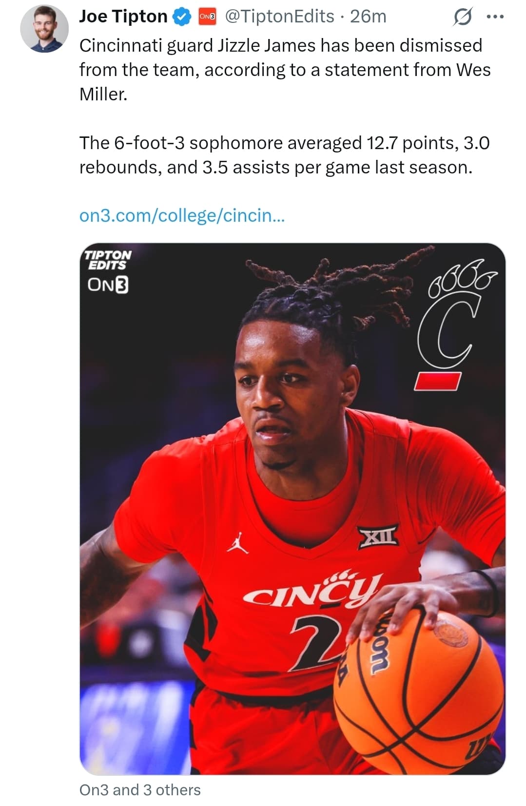IF UC had booted Jizzle in the early offseason, and took the outrageous money we are paying him and subbed it with a scoring wing or guard then this team looks really friction good. But I have a feeling this team is mediocre and this is Wes Millers last season as a head coach for UC.