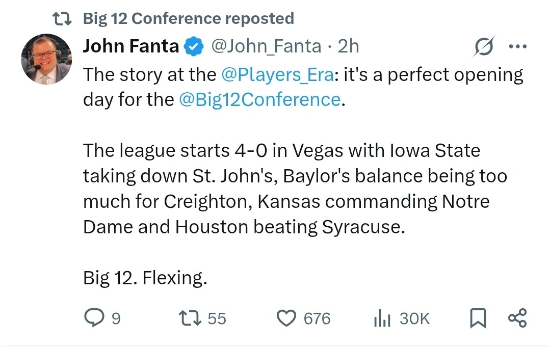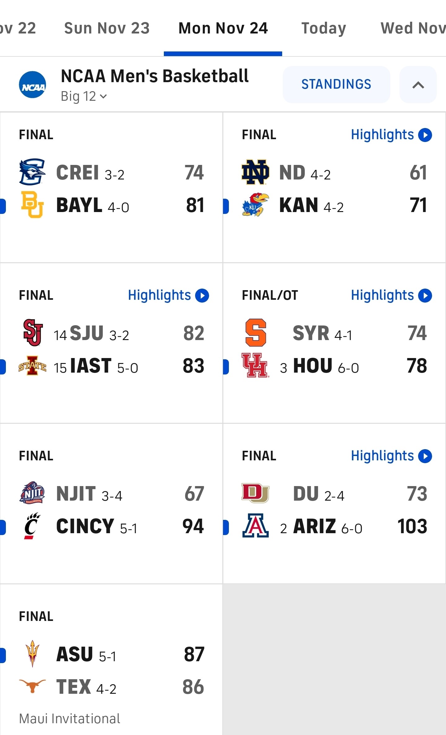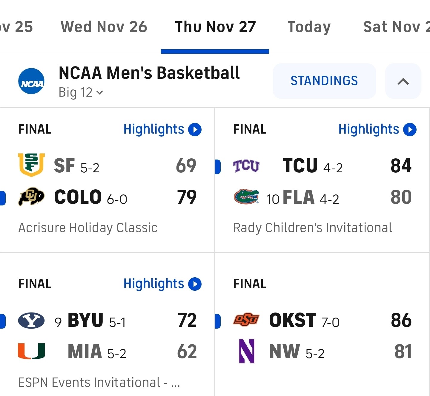 Wow! The Big 12 was perfect on Monday with a record of 7-0, including 5-0 vs high-majors. ASU put the cherry on top by beating UT in the last game.