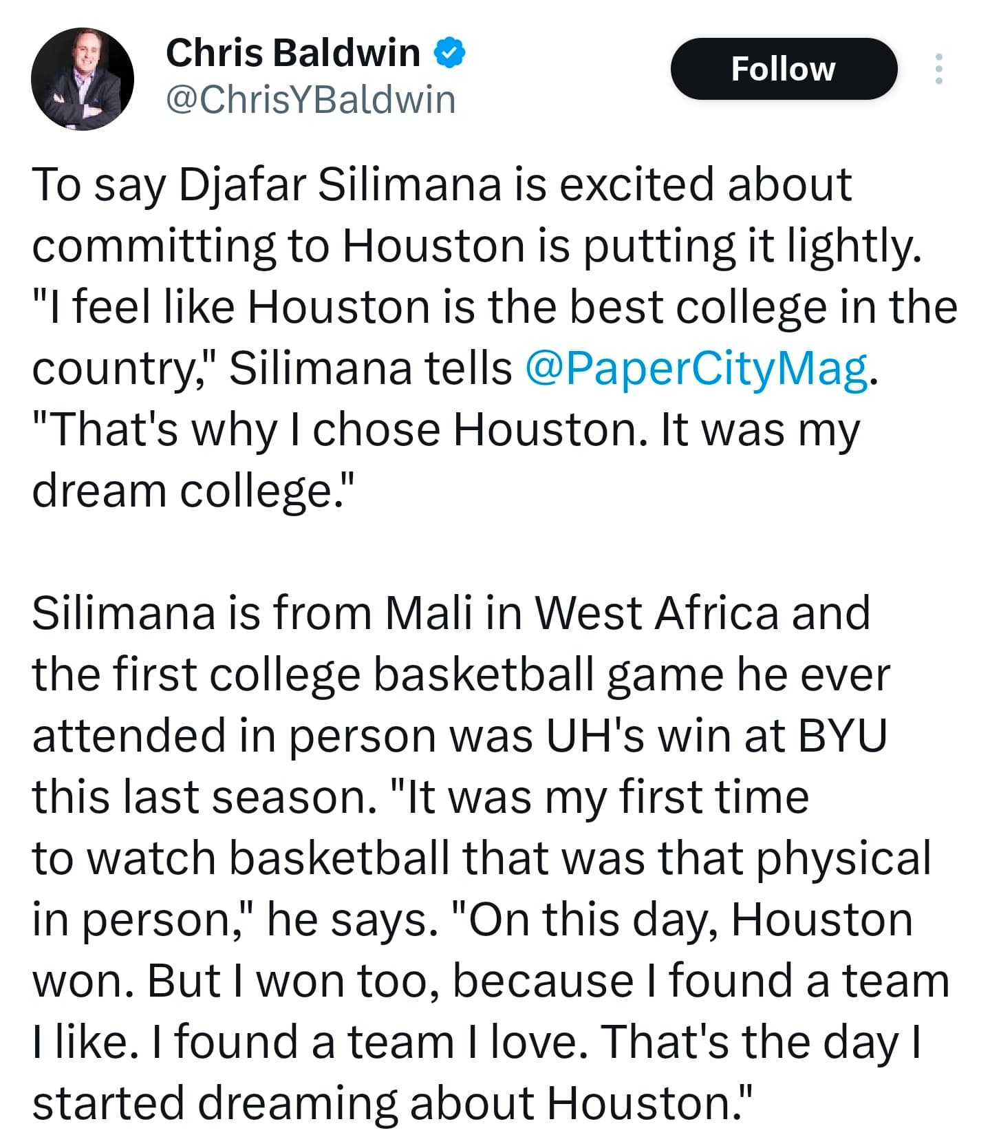 Absolutely…He fits the culture and seems ready to work real hard with the coaches to become a better player and learn the Cougar way of doing things during his redshirt year. He’s from Mali, in Africa, so thats another interesting thing about him. Very excited to be coming…