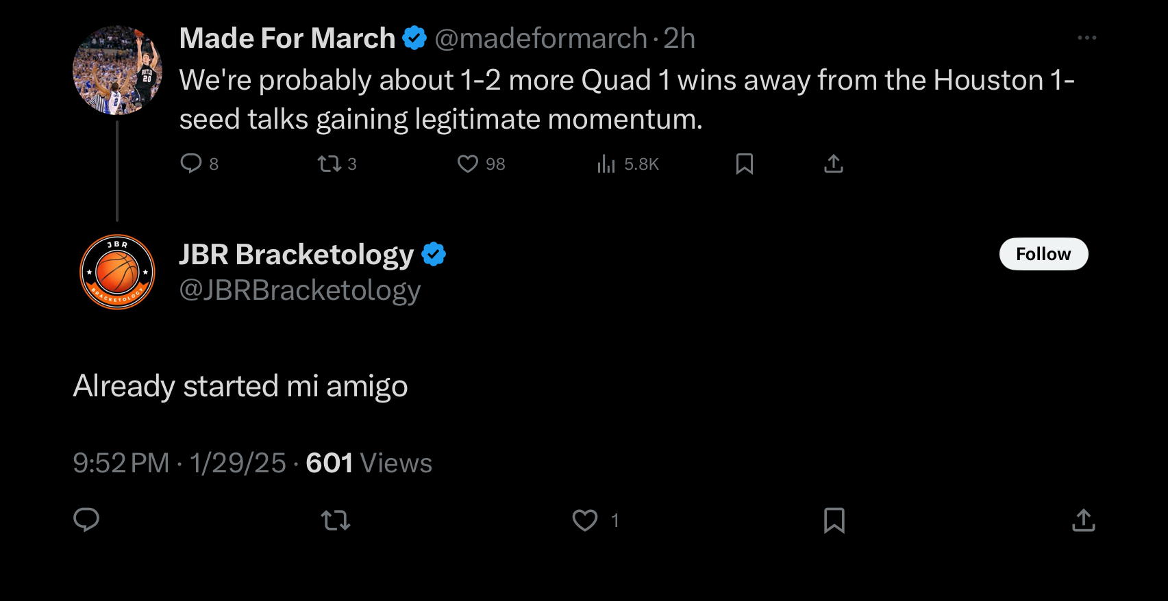 If UH wins the Big12 regular season, I feel pretty confident we will be a 1 seed (75%+). To win the Big12 UH would need to go 8-4 at worse, which likely gives us 6/7 more Q1 wins. Plus a chance to add a couple in KC. The lack of Q1 wins is the only thing holding us back at this point.