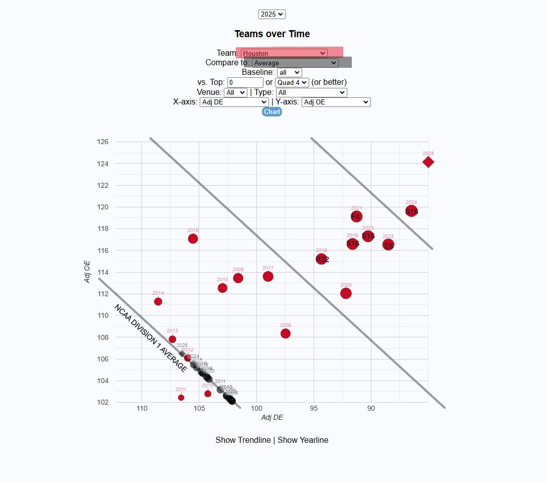somewhat related to bracketology… was on Bart Torvik messing around with their analytics and was able to create this graph showing our program year by year AdjOFF/AdjDEF compared to the NCAA D1 average and I was very surprised by where 2025 is currently.