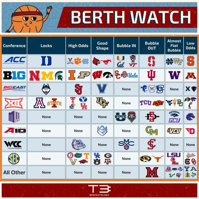TCU and WVU have a couple of home games vs the top 6 left and they’re the most likely bubble teams but with how things are going idk if they can steal one to be able to get the charity bid lol