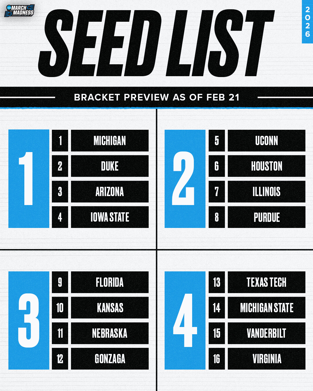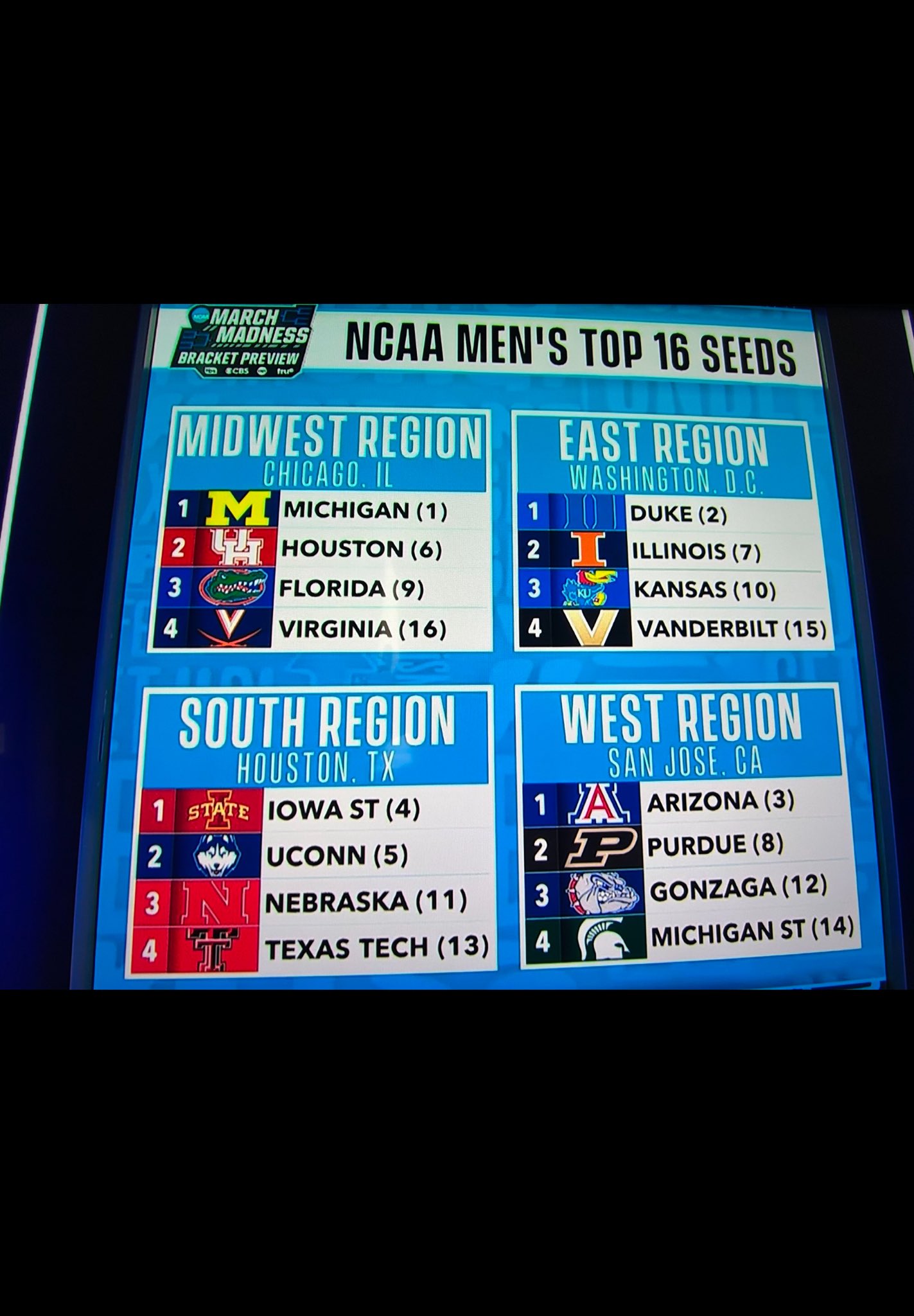 Michigan and Duke get hosed as the top 2 number 1 seedw, as does Houston. I dont see how, at this point, Uconn is any higher than 7th on the seeding list.