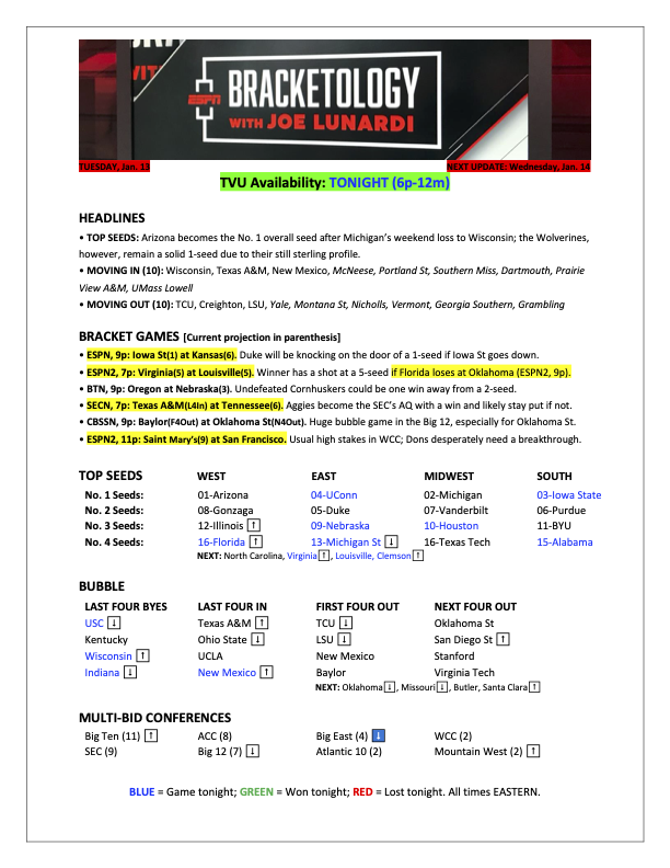 If it happens in NCAA ESPN basketball bracketology in January, it’s a prelude to March bracketology. Just like NCAA football pReSeAsOn RaNkInGs in August (that places Tennessee and Missouri in some off-the-wall rankings) are a prelude to season-long arguments of who belongs there in November. Apples to apples comparison.