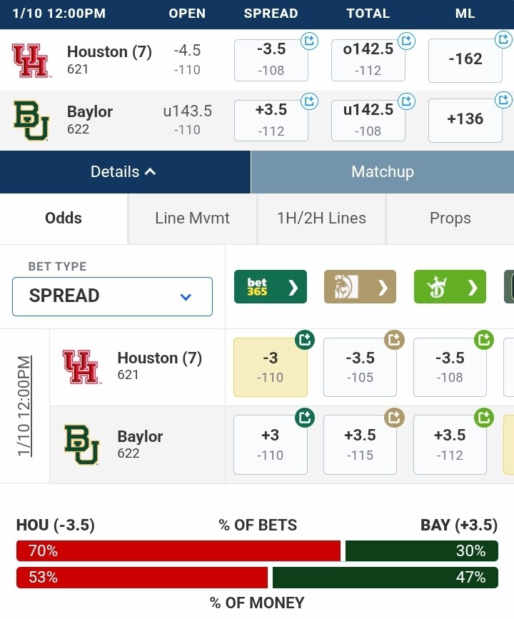 the moneyline for the Coogs in Waco is only -162. I fight that highly disrespectful, considering how the two respective teams have been playing recently. I took some of that, which I don’t normally do past like -125/-130…but it’s worth it at that number because the risk is so small, IMO. Compare that to KU -175 at the same open and current number. -162 is screaming home upset, and I just don’t see it from the Bears. Houston is too tough and Flemings is playing out of his mind. I also laid -3.5 @Kyle_Be_Coogin
