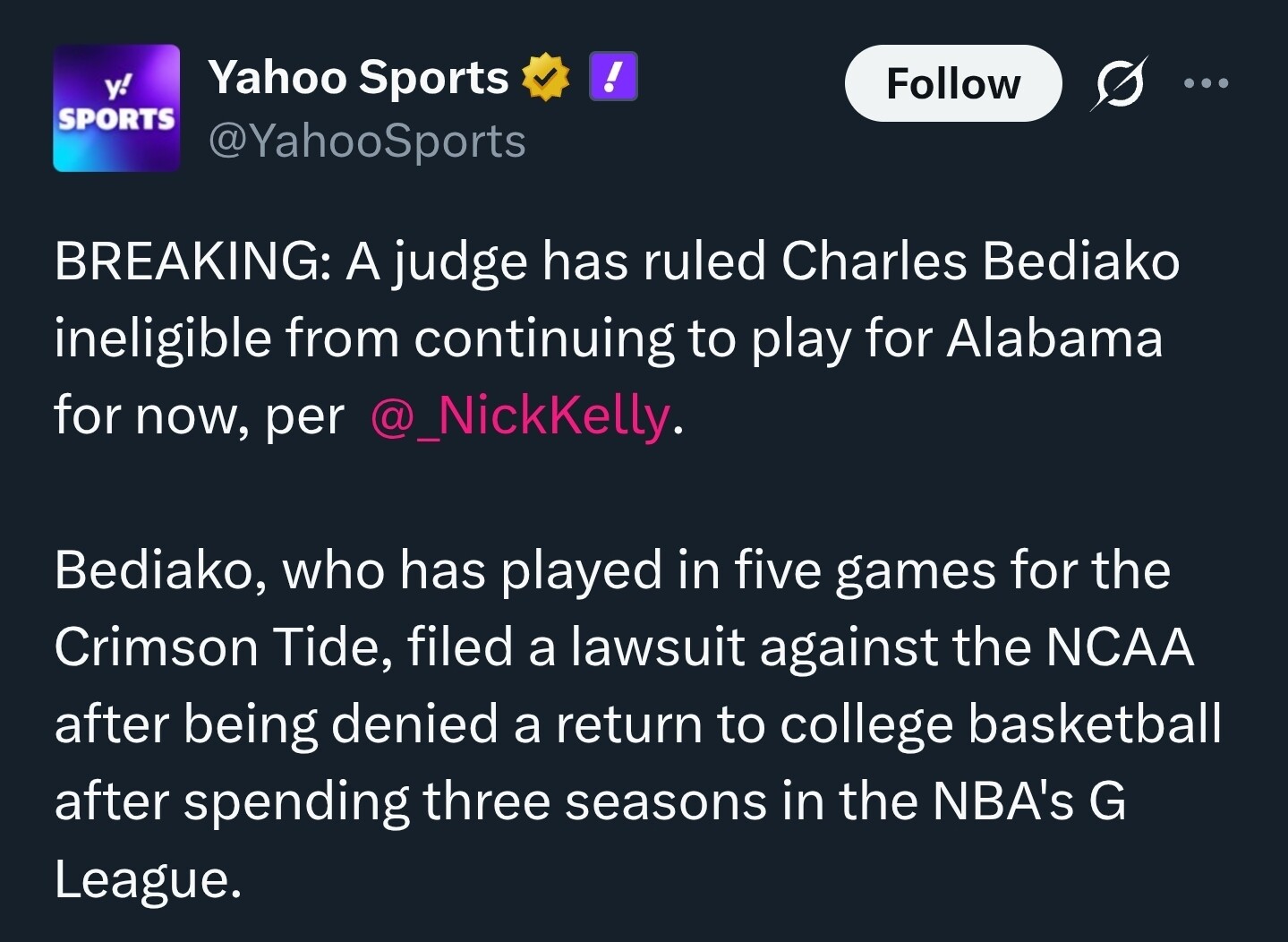 Not sure how many big deal Alabama donors are in position to hear this case like the one that granted the injunction for him to play, so the bouncing probably stops now