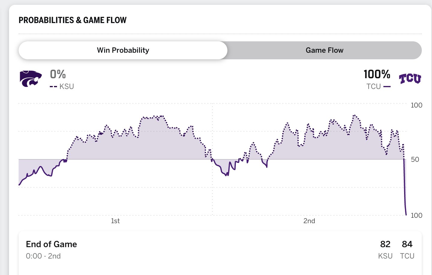 KSU blew an 18 point lead. TCU took the lead with 5 seconds left in the game.