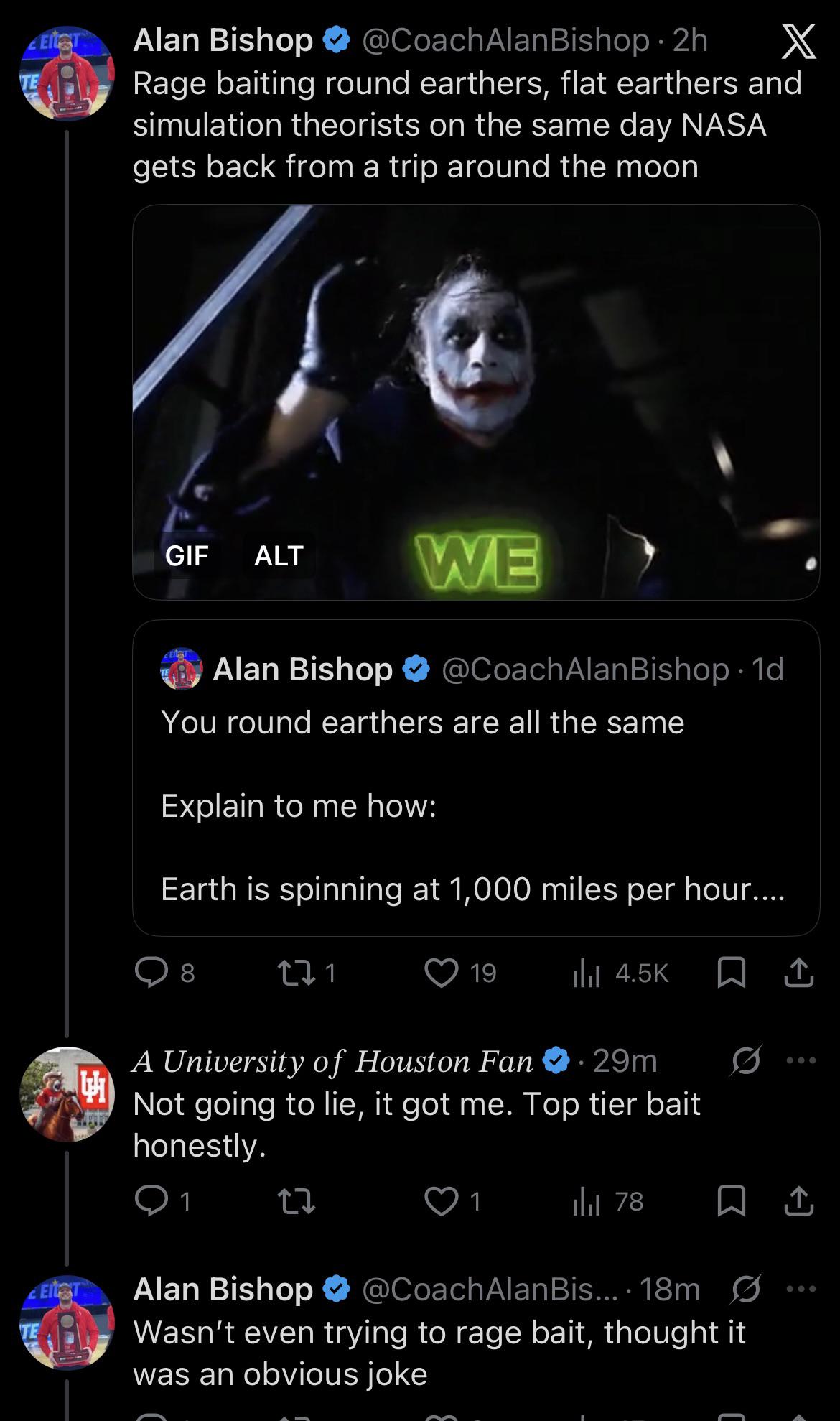 I mean, that post very well could have come from a flat earther. Besides the whole “round earthers” bit, which could have been a sincere or sarcastic dig, he was saying the exact same kinds of thing that actual flat earthers say. At the very least, it’s well within Poe’s Law territory.