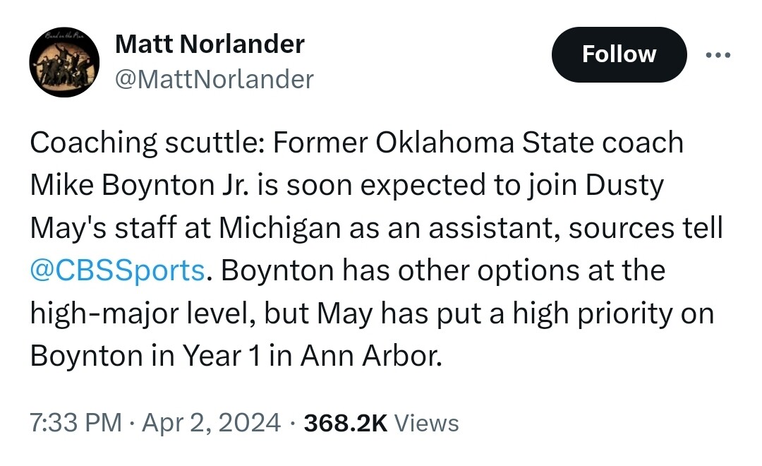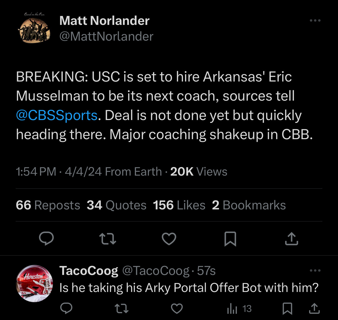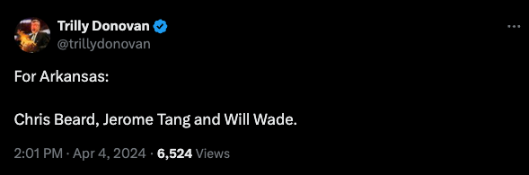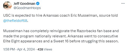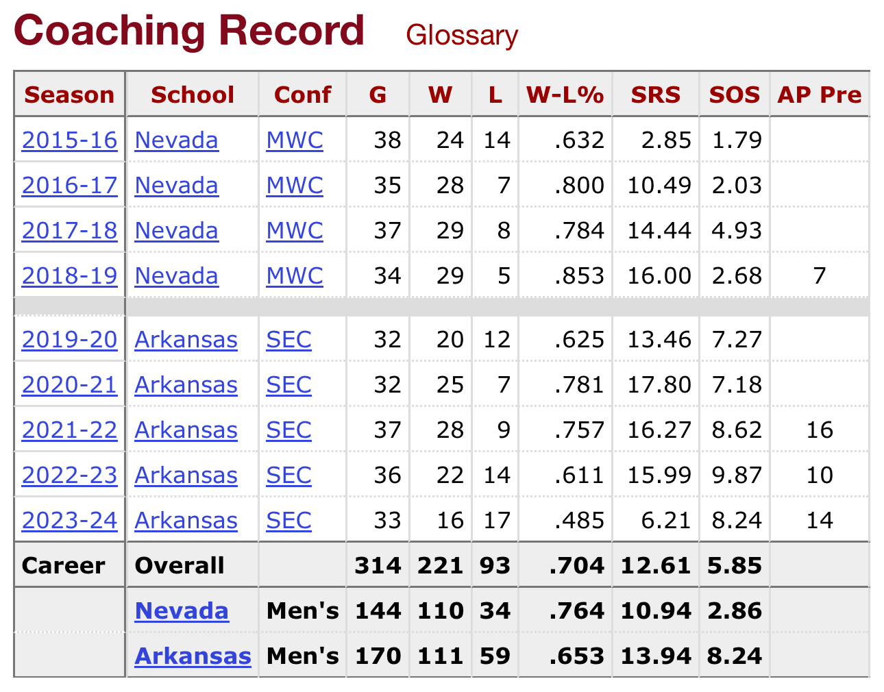 If I were a USC fan, I wouldnât be very happy about a potential Muss hire. Despite a LOT of high-quality transfers, Arky finished outside the top-10 in the SEC and under .500 overall. If we had done that, this board would be apopleptic talking about Sampson being washed. Four Sweet Sixteens in a row or not, that should be enough to give the next team pause in hiring him.