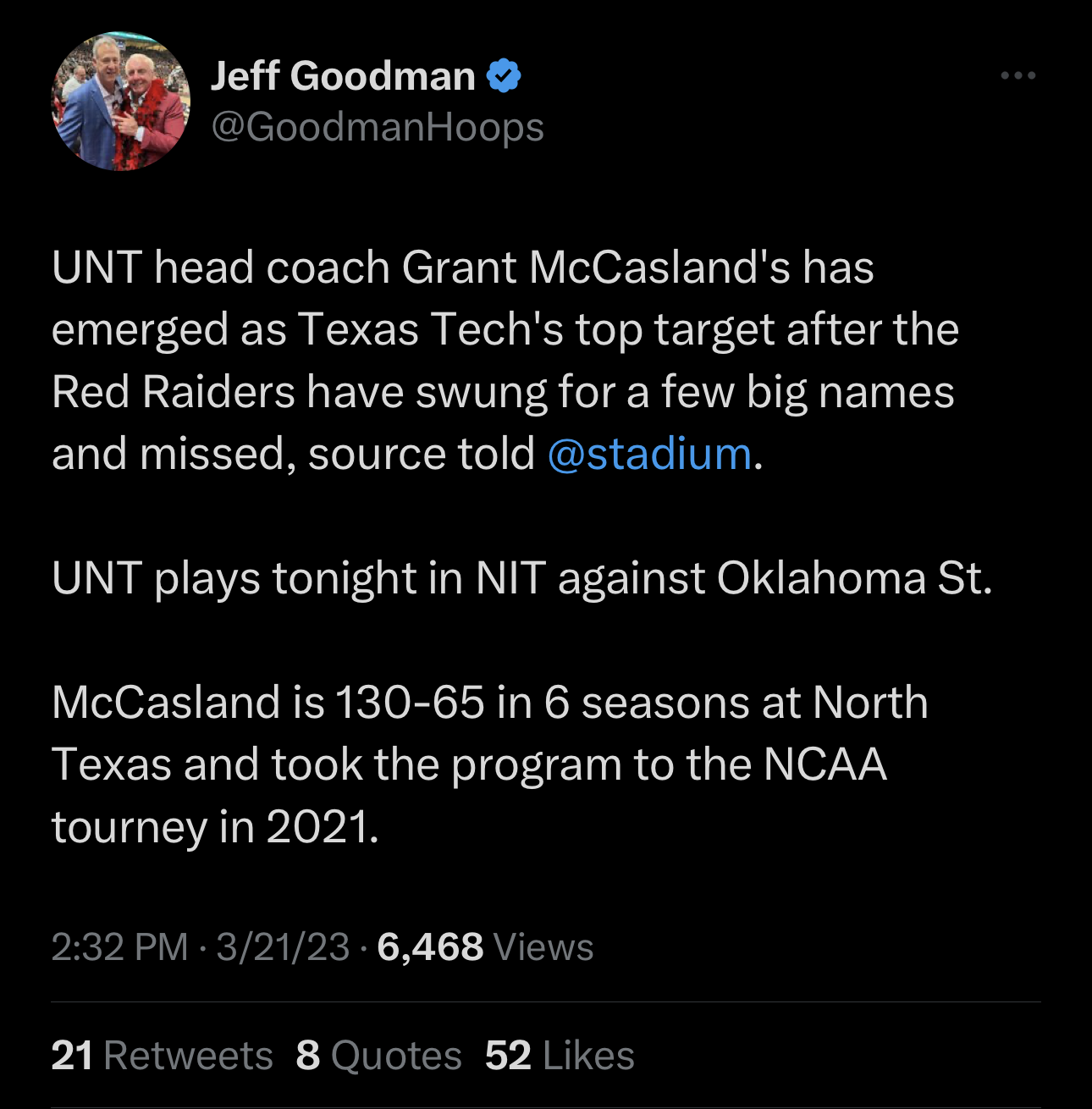 McCasland has likely been the main candidate since about December. I think he’s a good fit for them as long as he can get some recruiters on staff. They have top-notch facilities and great fan support there, so the right coach will get some guys who can play.