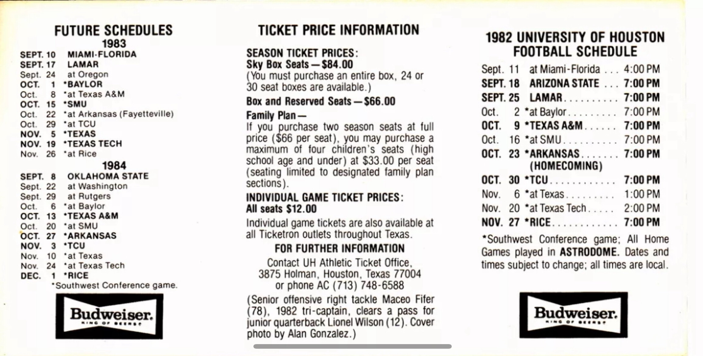 A mint Houston Cougars 1982 pocket schedule with single game and season ticket prices from 1982.