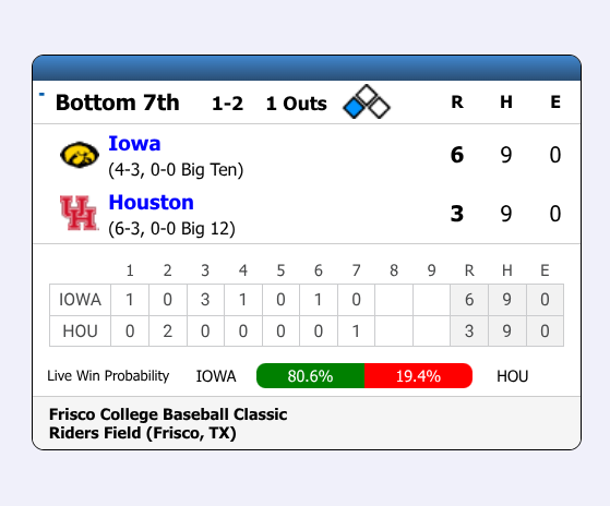 6-4 loss. DIII Wisconsin-Platteville managed to score five runs on Iowa.