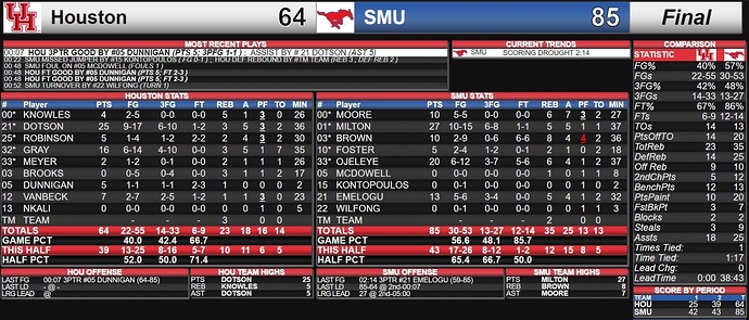 Folks, I just got home from that game in Dallas, and people on here need to understand a couple of things. First - that SMU team is for real; they are big, and talented! Second - their newly-renovated arena is “tight,” but very nice. And third, we would all kill for the kind of support they are getting in Dallas for that team; the arena was sold out, (that’s 7,000 tickets sold!); and my ticket - in the end zone - cost $55.00!!! - plus a $5.00 fee. I was afraid to even ask what those box seats cost!