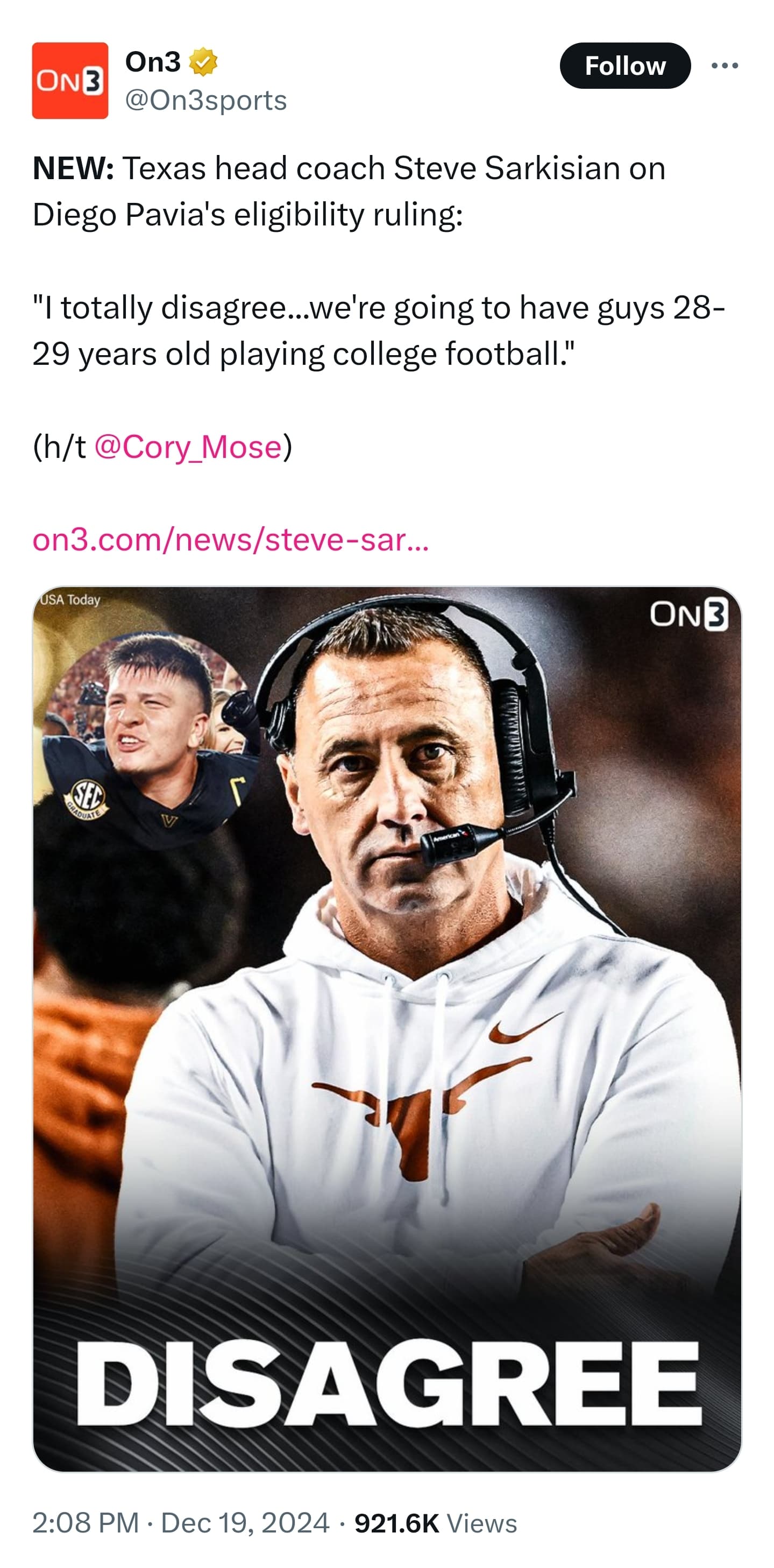 Of course UT doesn’t agree with the new JUCO rules. Sarkisian will have a lot of 5 and high 4 stars that will go pro after 3 years, while schools like UH and Tech could have experienced 6, 7 and 8 year players.