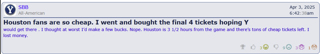Pretty stupid for buying Final Four tickets thinking BYU would get thereā¦ā¦gets what he deserved.