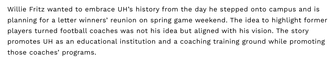 Chris I am excited as well. The comments about Pez and his idea to recognize UH Grad Coaches at local high schools are correct .This is a new day . It does cause me to think that Pez was stonewalled by Dana . We do know that Dana would not have a P4 level spring game . If that is the case,then Dana has more baggage than we knew . I just can’t imagine Pez letting this happen. Suddenly Pez is a font of good ideas ? This is some more of the high strangeness swirling around the A/D 's office. I am just thinking out loud …