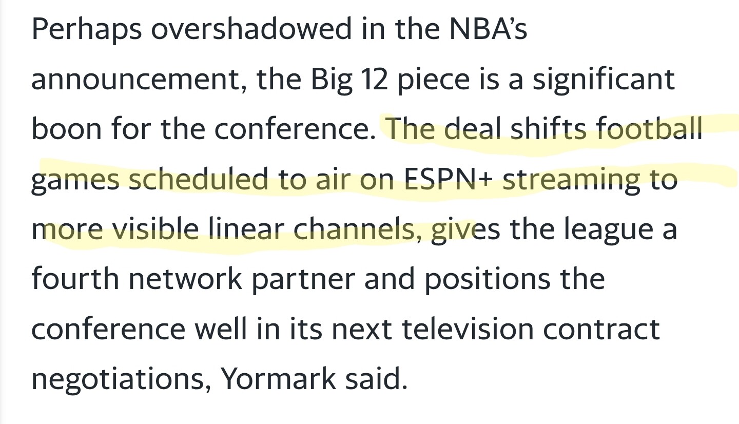 I guess you guys forgot the Big 12 is getting off ESPN+ starting this Fall. Well most of those game will be off ESPN+.