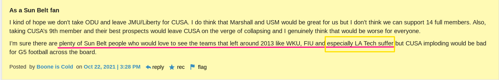 The Louisiana Tech thing I get, but I don’t think there were any SBC teams that would have passed on an invite at the time and I don’t remember either of them being too antagonistic.