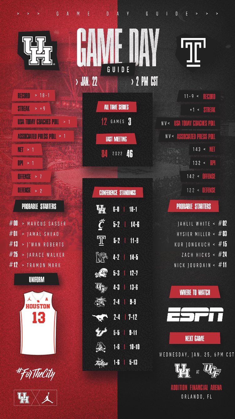 “With that in mind, it will be interesting to see what McKie does with his starting lineup at Houston. Since AAC play started seven games ago, McKie has had top scorers Khalif Battle and Damian Dunn coming off the bench. A bigger starting lineup with only one pure guard – Hysier Miller – worked nicely until the last two games against Memphis and ECU.”