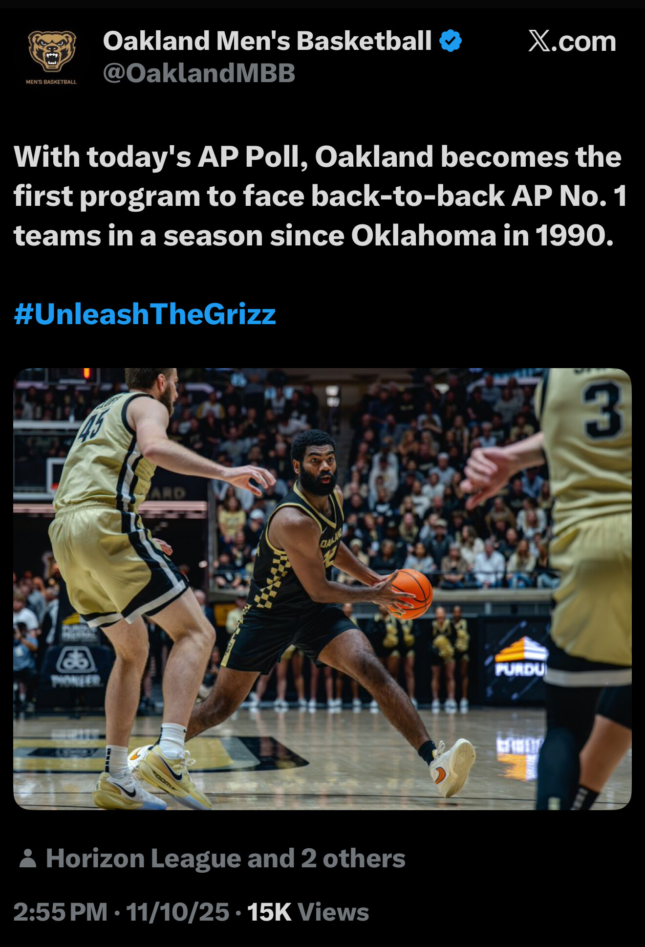 Oakland played #1 Purdue on Saturday, and are playing #1 Houston tomorrow night in consecutive games.