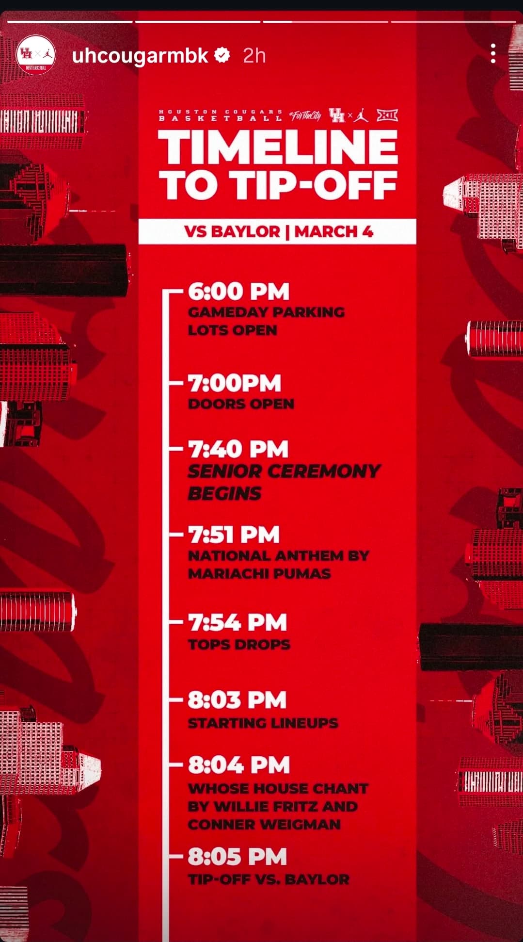 Personal, selfish opinion that can’t really be fixed: I wish they would stop doing Senior Night on week nights. My wife and I wanted to be there so badly, but out-of-town Coogs comes with its own curse. We’re at most weekend games.