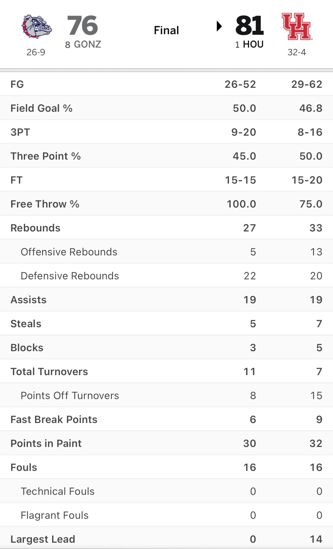 Gonzaga shot 50% from the field. That doesnât happen often against the Coogs. Kudos to them!